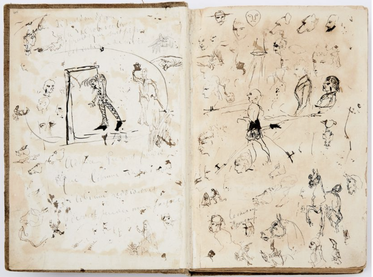 This is the old school textbook of Henri de Toulouse Lautrek - he was 16 years old when he needed to take a mandatory Latin class, and seems to have spent most of his time in class doodling on the margins of his grammar book. There are over 400 tiny ink drawings in this book, of everything from his classmates and teachers, to horses and the pierrot on a gallows, below - the latter seems to be a warning to anyone who might borrow the book and not return it - the text under it reads: "Look at Pierrot hanged, who did not return the book; if he returned it, he would not have been hanged.".