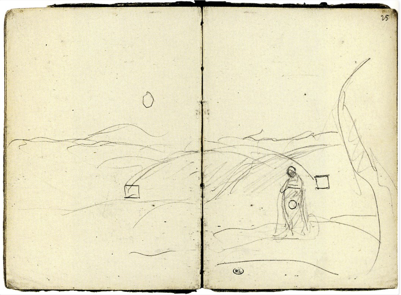 Corot travelled constantly over the course of his career, taking inspiration both from the changing European landscape and the work he saw by other artists. He explored France extensively, travelled through Holland and Belgium took several long, formative trips to Italy to study the Italian renaissance masters and spend time with other young landscape painters (there are pages from his italian sketchbooks drawn by his friends). He filled over 80 sketchbooks with his travel itineraries, notes and quick, gestural graphite drawings.